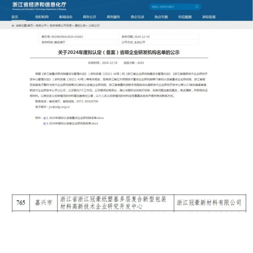 近日,浙江省經(jīng)濟和信息化廳公示了 2024 年度省級企業(yè)研發(fā)機構(gòu)認定結(jié)果,浙江冠豪順利通過浙江省高新技術(shù)企業(yè)研究開發(fā)中心認定,被正式授予“浙江省浙江冠豪紙塑基多層復合新型包裝材料高新技術(shù)企業(yè)研究開發(fā)中心”稱號,這一重要成果標志著浙江冠豪在科技創(chuàng)新和研發(fā)能力方面邁出了堅實的一步。