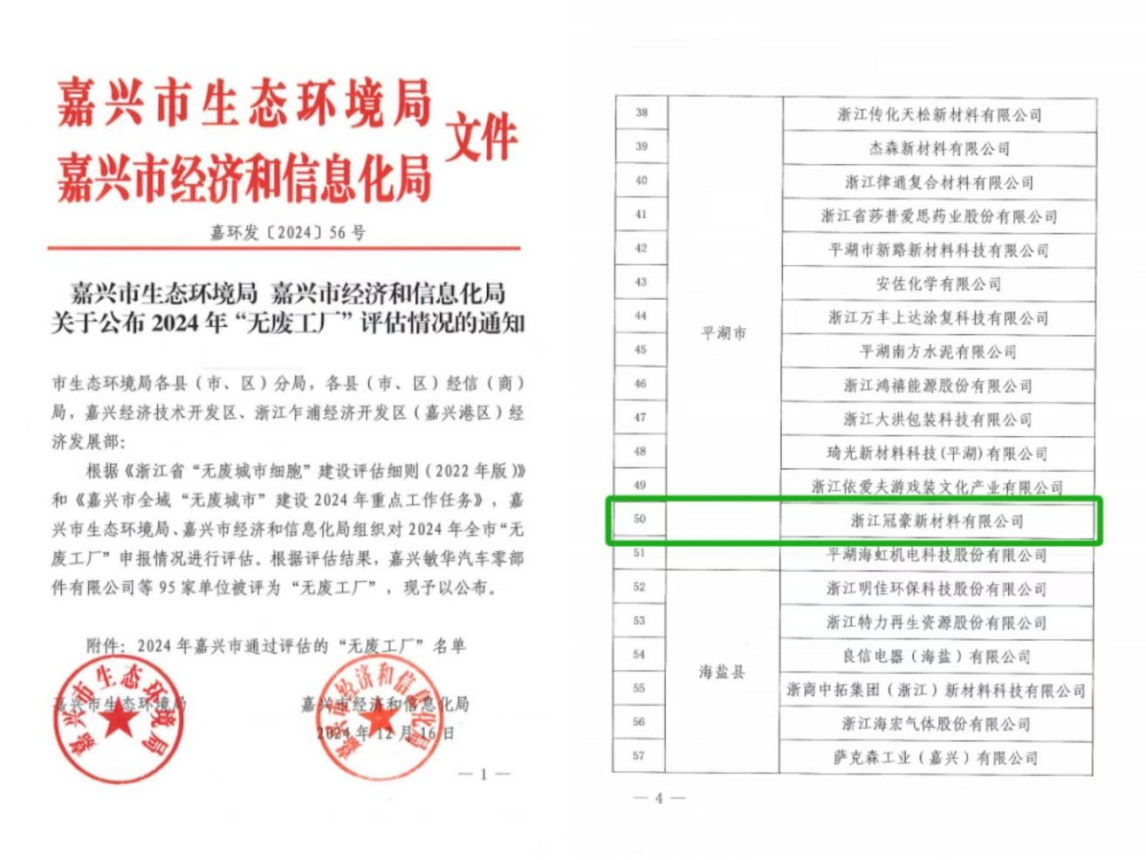 近日,嘉興市生態(tài)環(huán)境局和經(jīng)信局正式公示了2024年“無廢工廠”名單,浙江冠豪順利通過評審,成功獲評“無廢工廠”稱號。